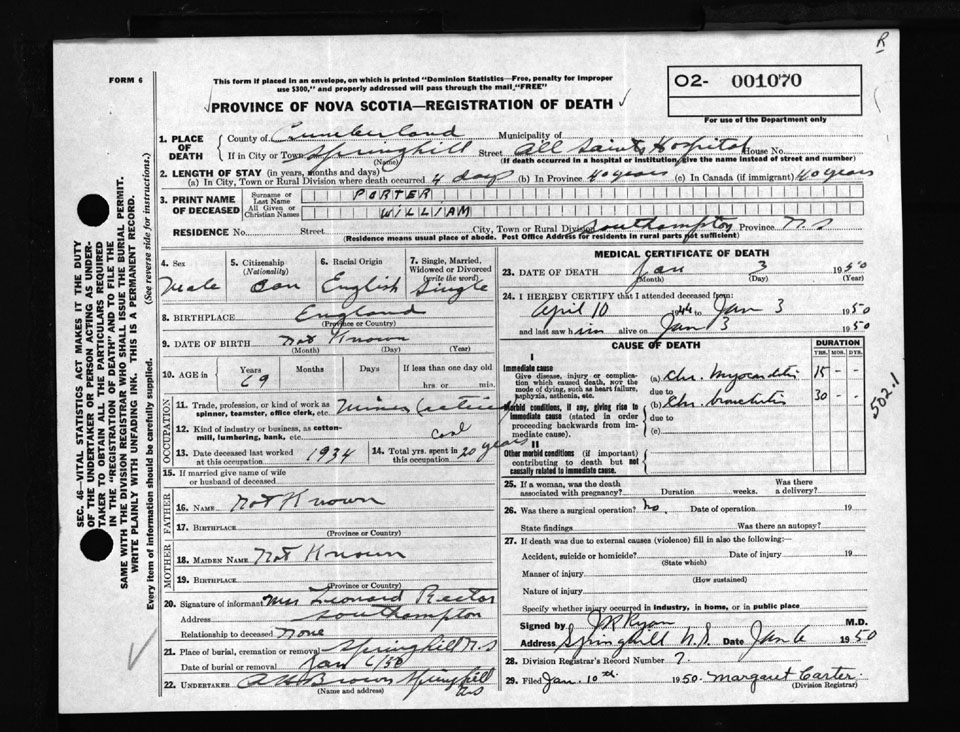 Male Death Registration: Year: 1950 number: 1070