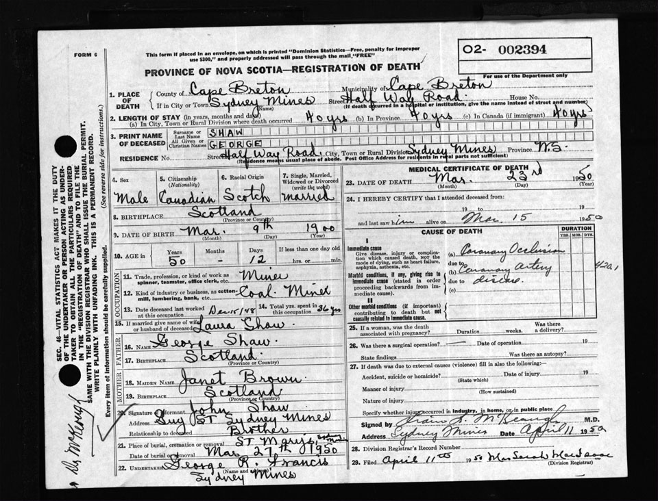 Male Death Registration: Year: 1950 number: 2394