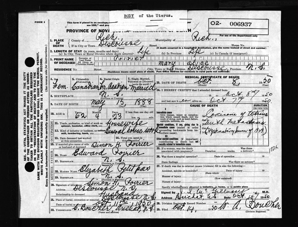Female Death Registration: Year: 1950 number: 6937