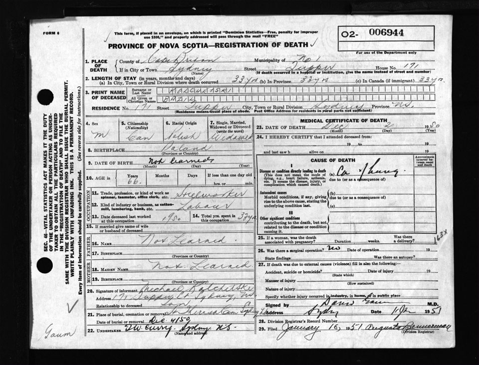 Male Death Registration: Year: 1950 number: 6944