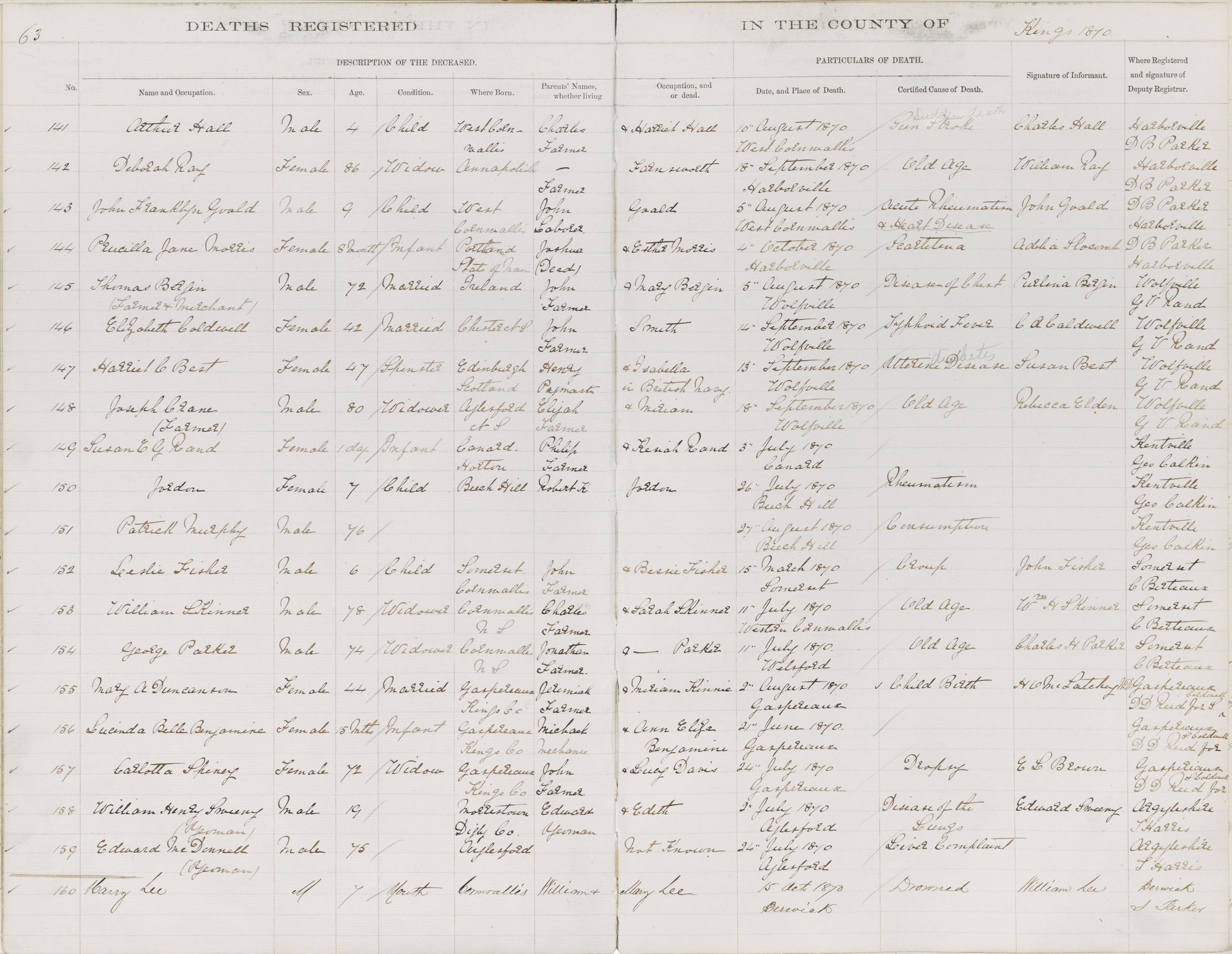 Death Registration: Year: 1870 book: 1811 page: 63 number: 160