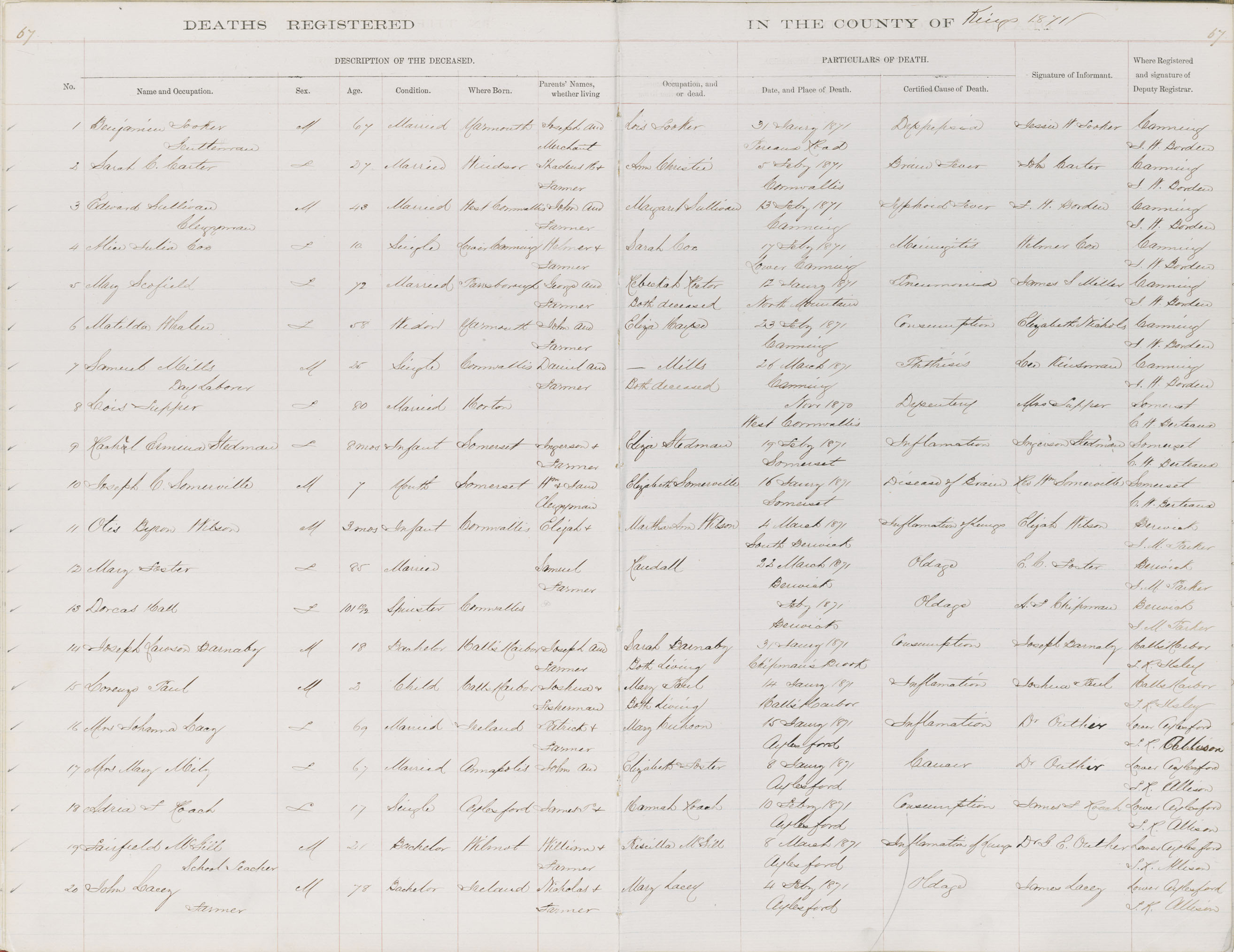 Death Registration: Year: 1871 book: 1811 page: 67 number: 20