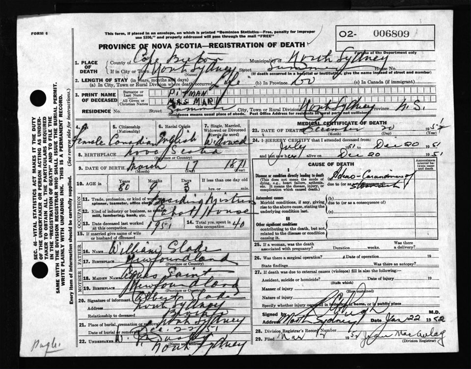 Female Death Registration: Year: 1951 number: 6809