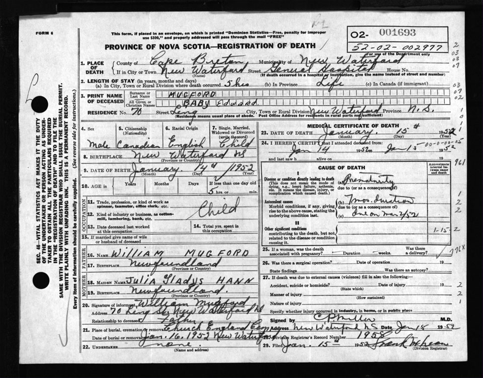 Male Death Registration: Year: 1952 number: 1693