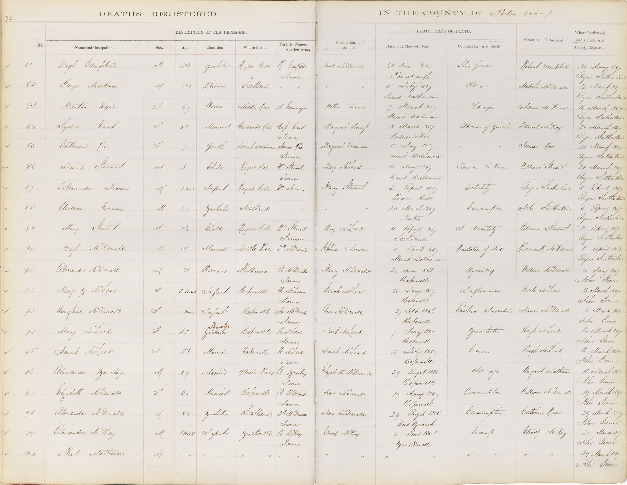 Male Death Registration: Year: 1866 book: 1813 page: 25 number: 100