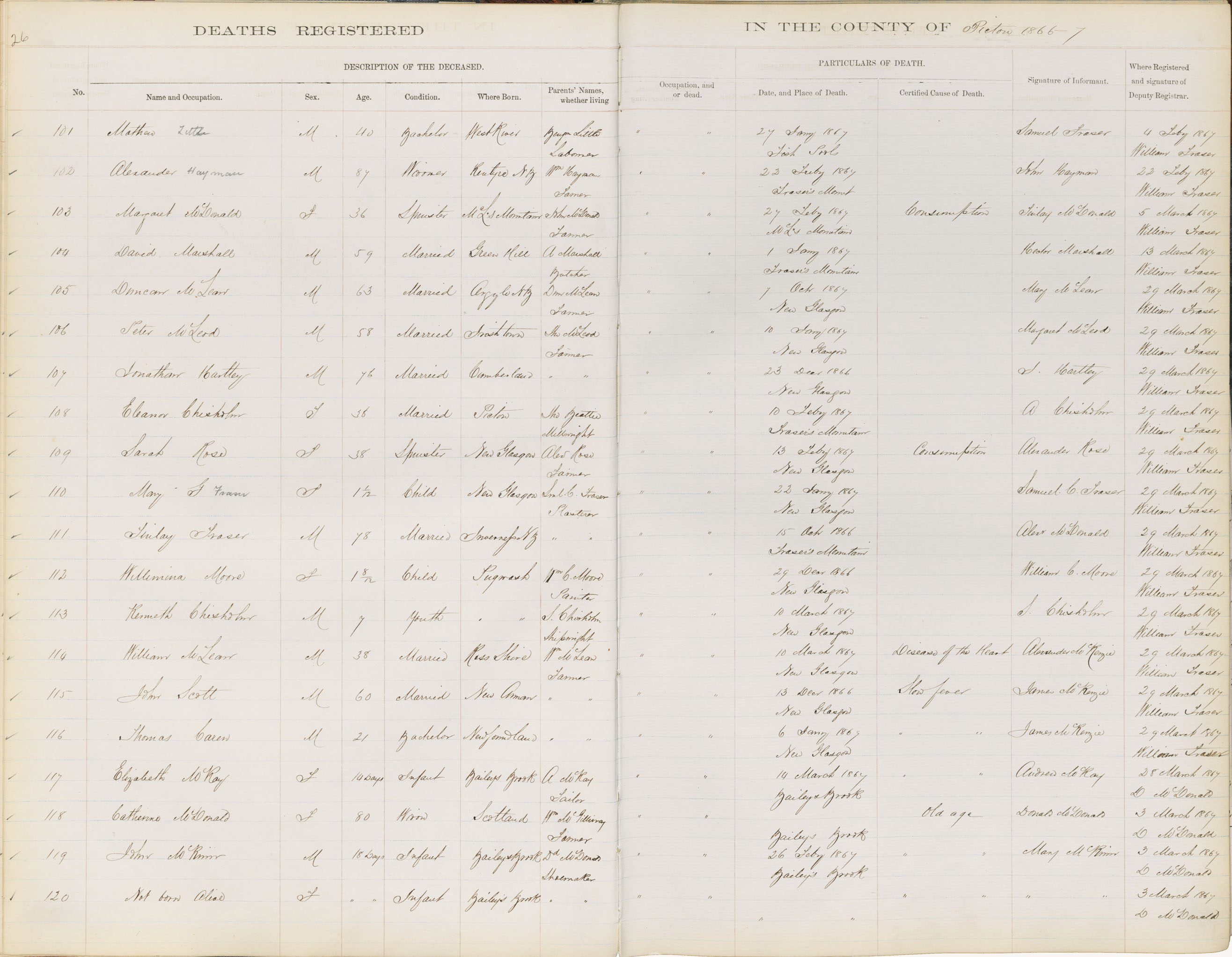 Female Death Registration: Year: 1867 book: 1813 page: 26 number: 120