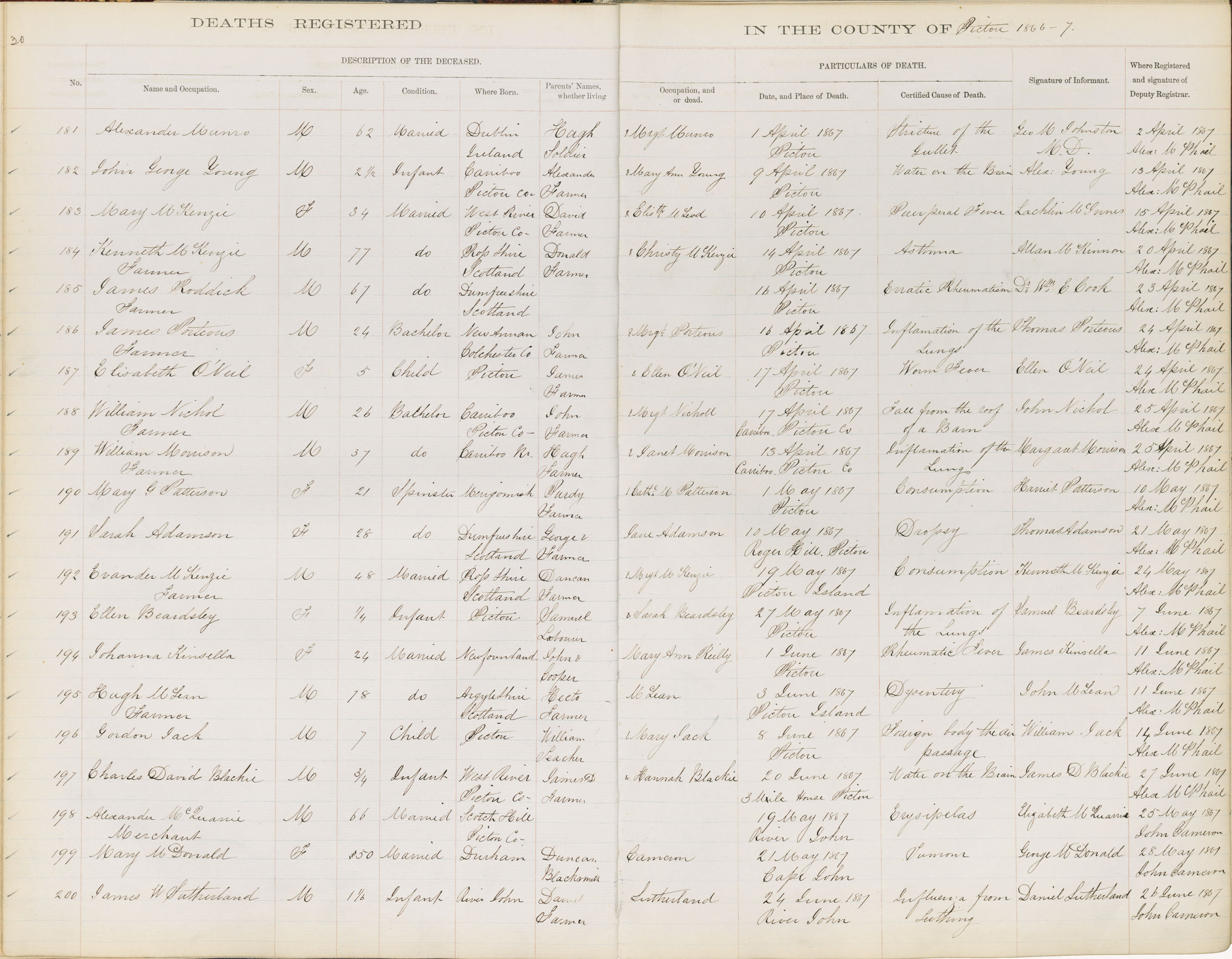 Death Registration: Year: 1867 book: 1813 page: 30 number: 200