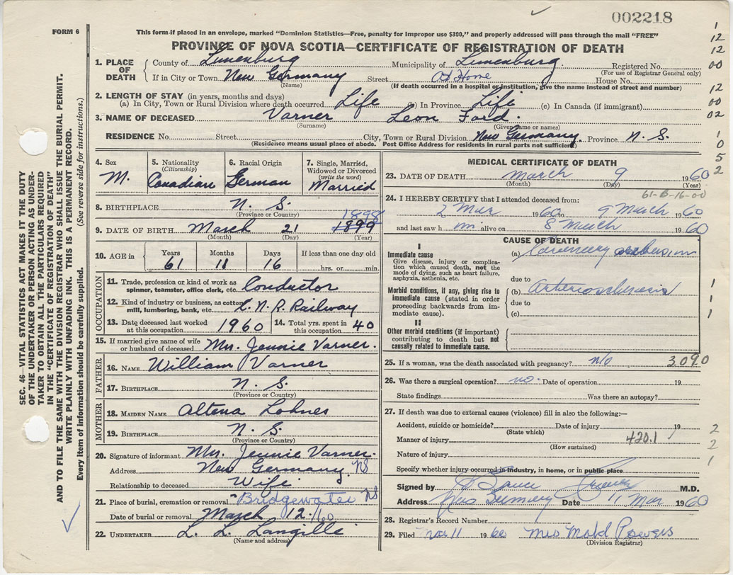 Death Registration: Year: 1960 number: 2218