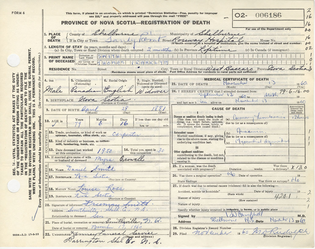 Death Registration: Year: 1960 number: 6186