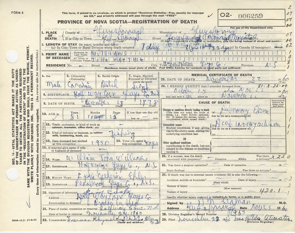 Death Registration: Year: 1960 number: 6259