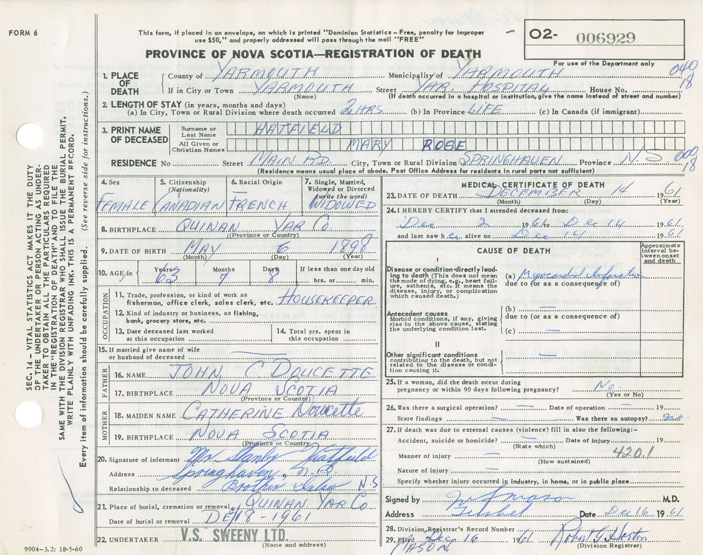 Death Registration: Year: 1961 number: 6929