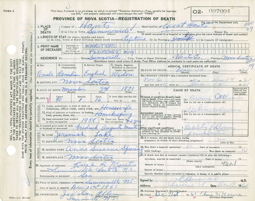 Death Registration: Year: 1961 number: 7004