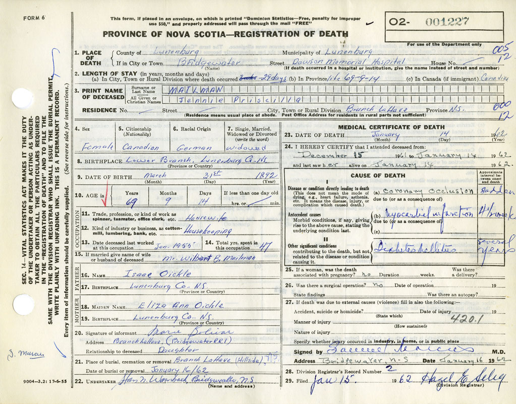 Death Registration: Year: 1962 number: 1227
