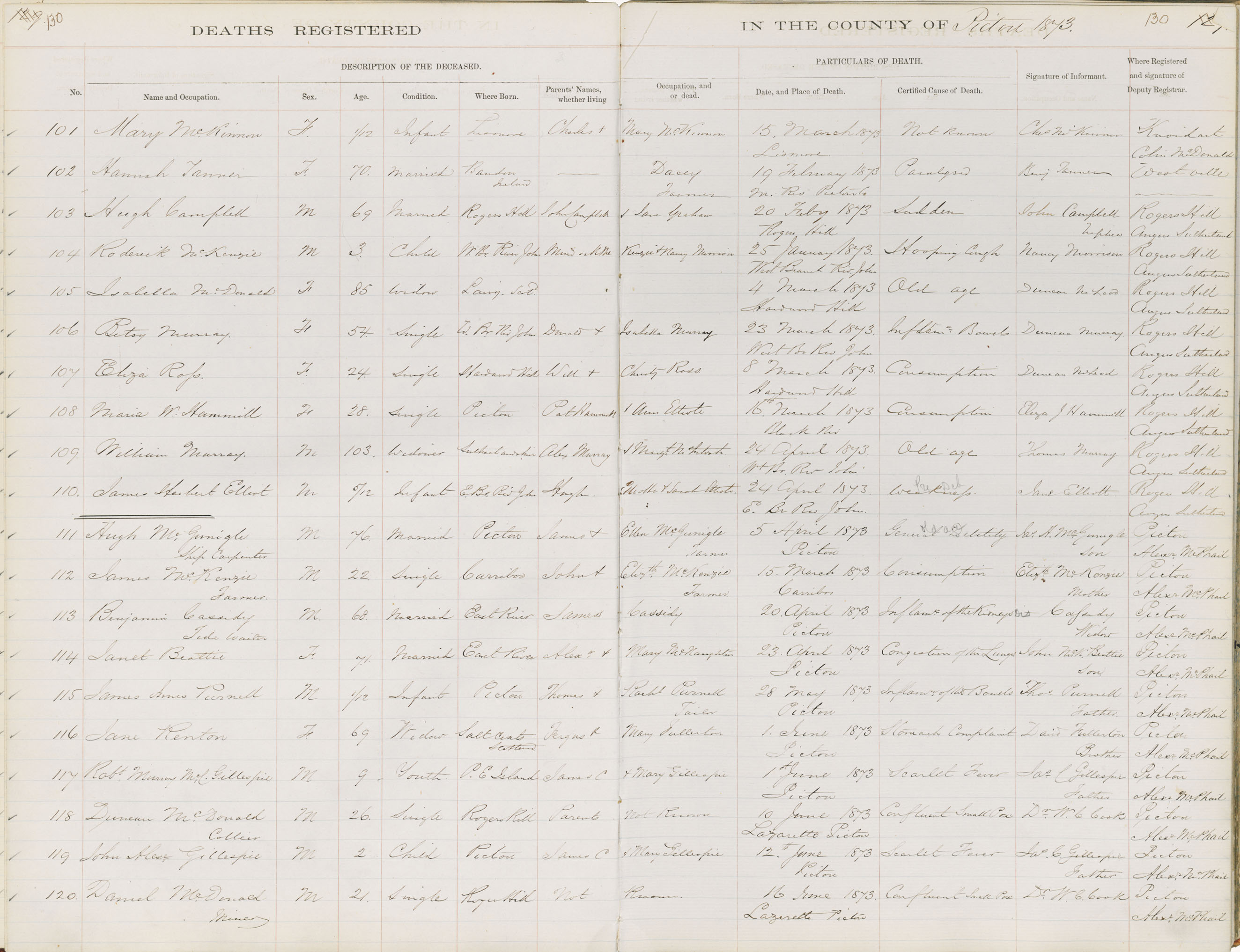 Death Registration: Year: 1873 book: 1813 page: 130 number: 101