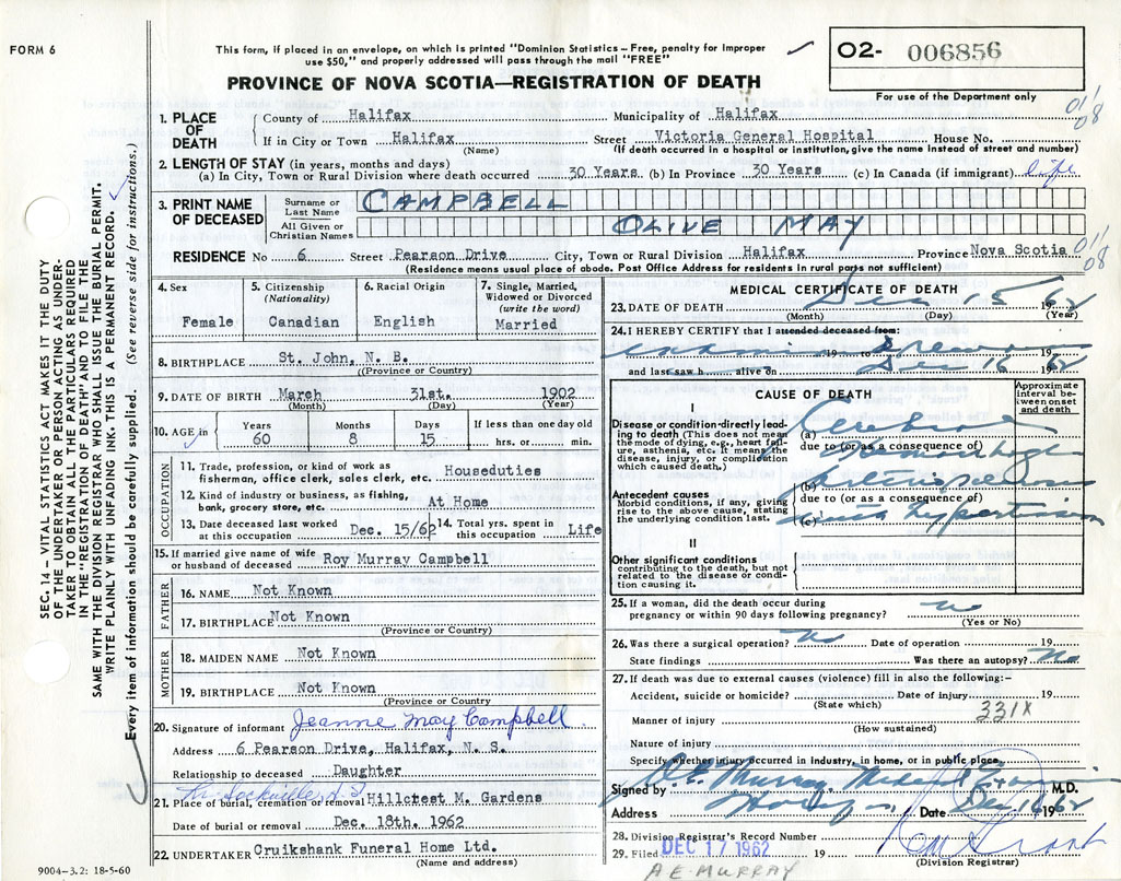 Death Registration: Year: 1962 number: 6856