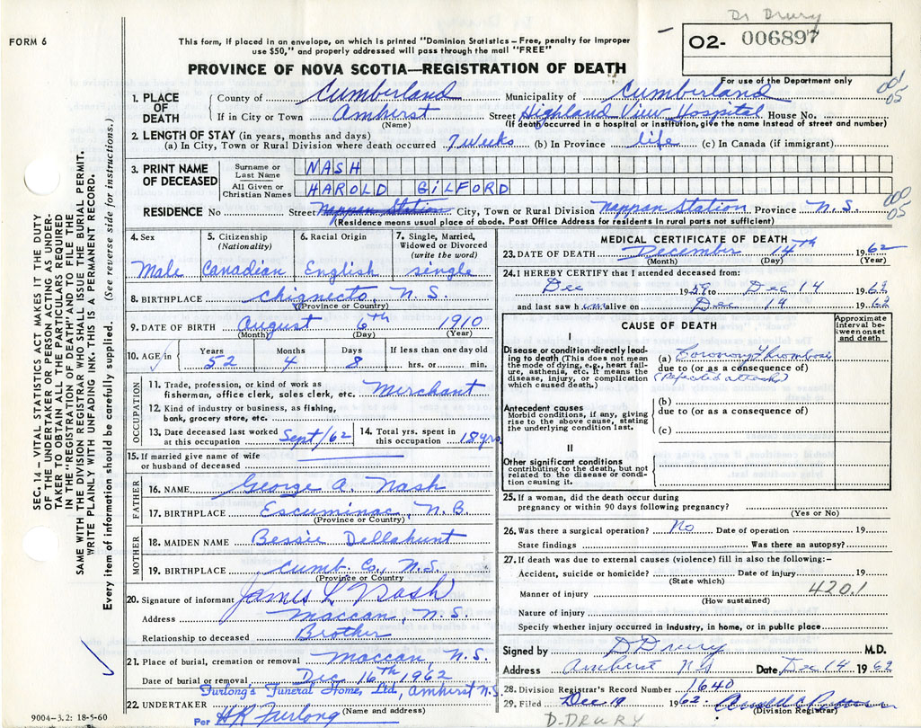 Death Registration: Year: 1962 number: 6897