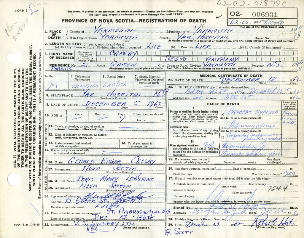 Death Registration: Year: 1962 number: 6931