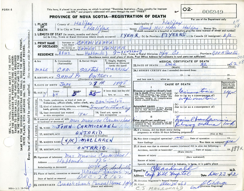 Death Registration: Year: 1962 number: 6949