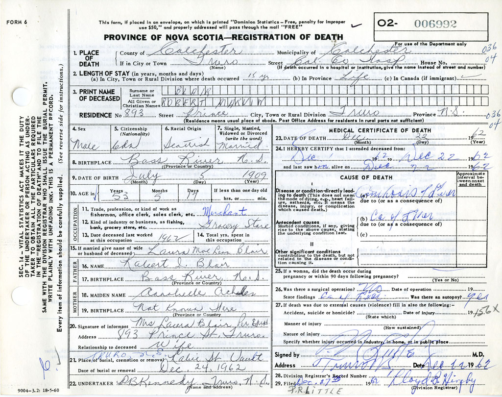 Death Registration: Year: 1962 number: 6992