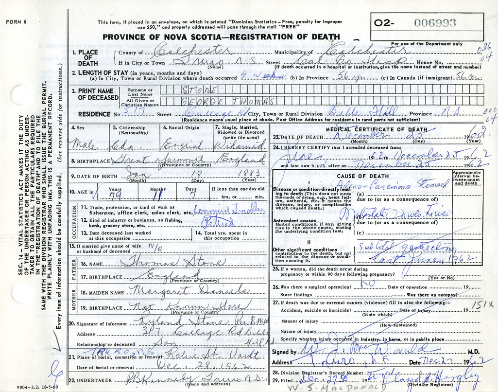 Death Registration: Year: 1962 number: 6993