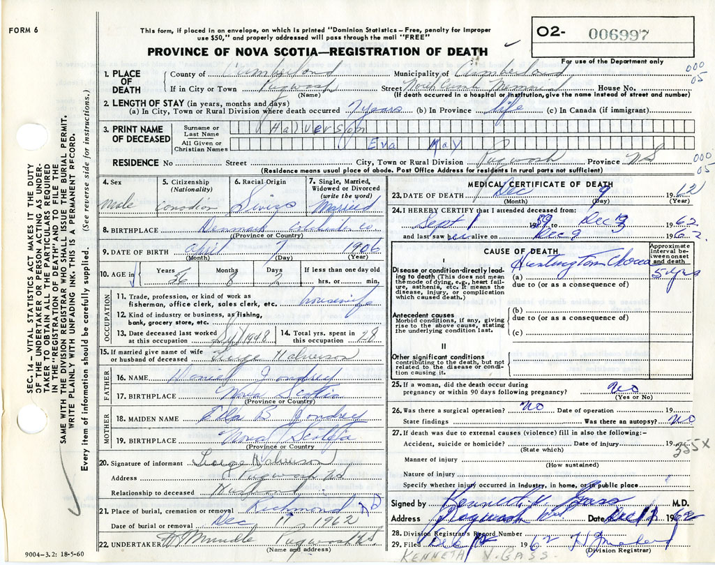 Death Registration: Year: 1962 number: 6997