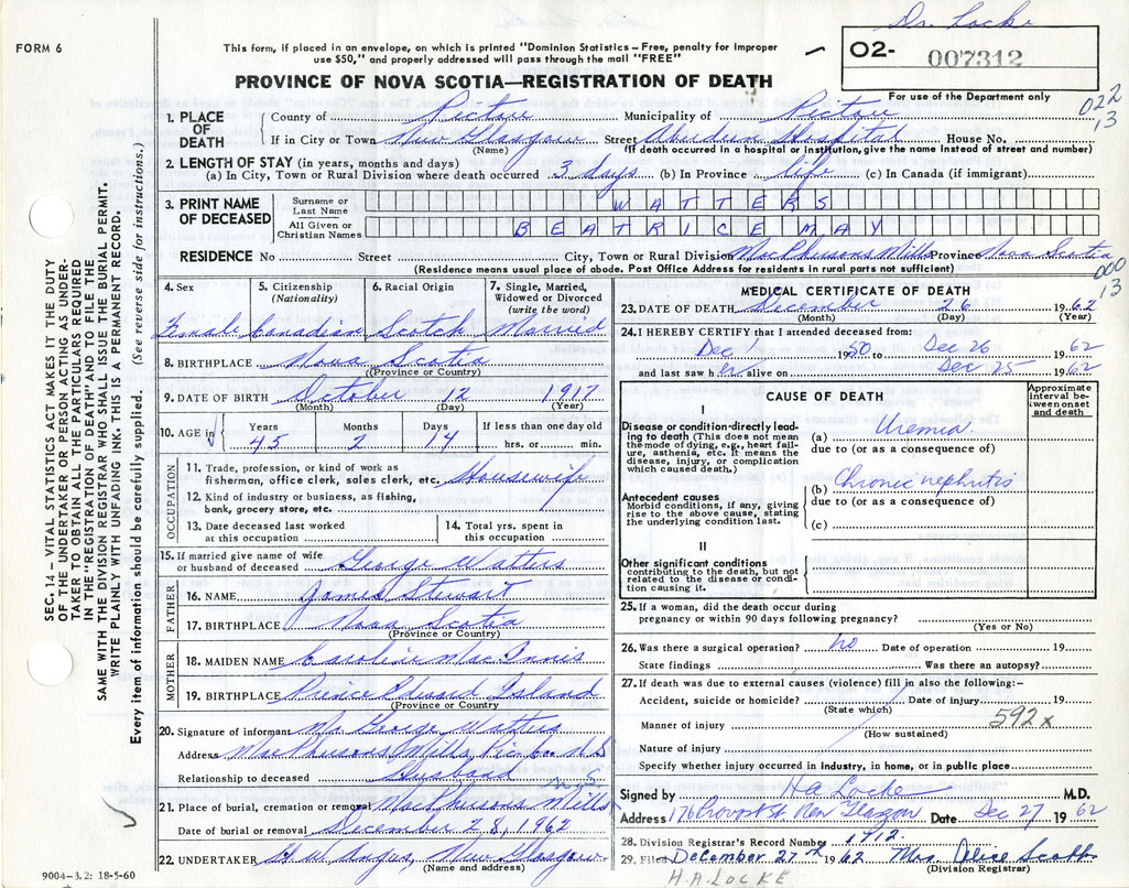 Death Registration: Year: 1962 number: 7312