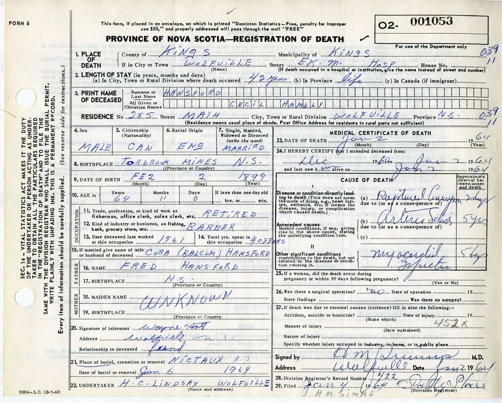 Death Registration: Year: 1964 number: 1053