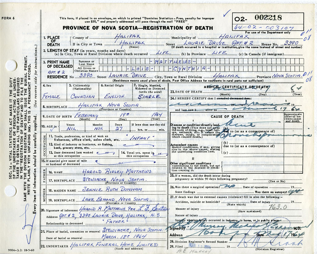 Death Registration: Year: 1964 number: 2218