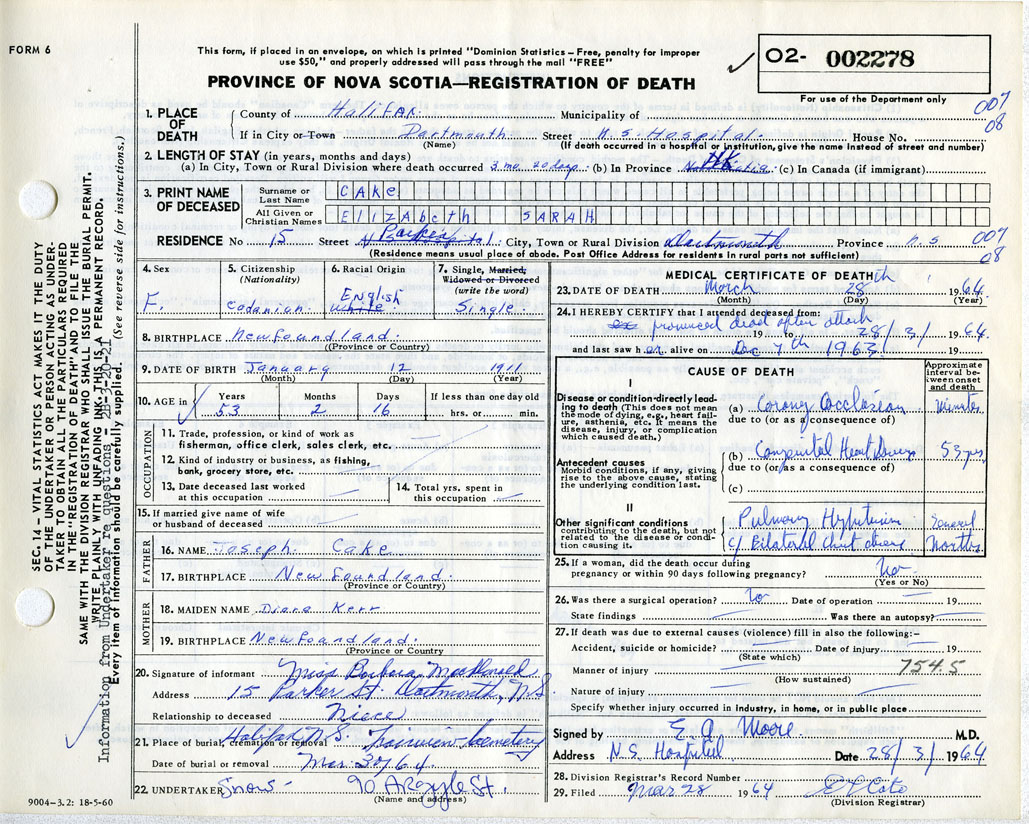 Death Registration: Year: 1964 number: 2278