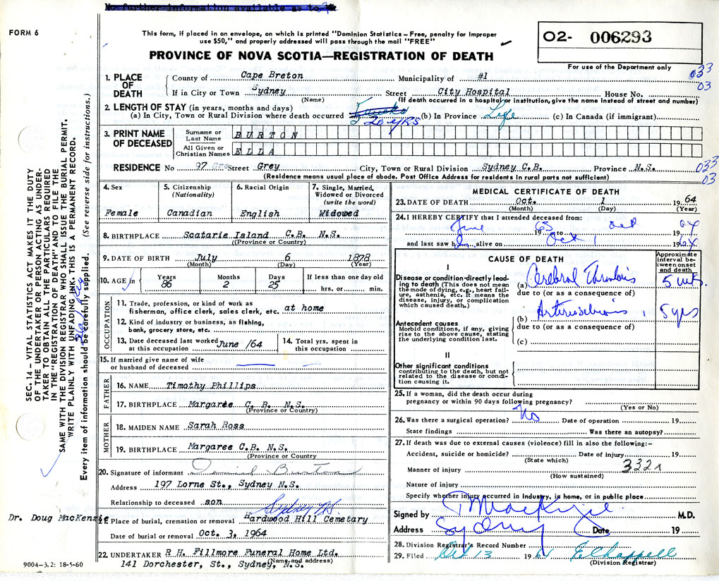 Death Registration: Year: 1964 number: 6293