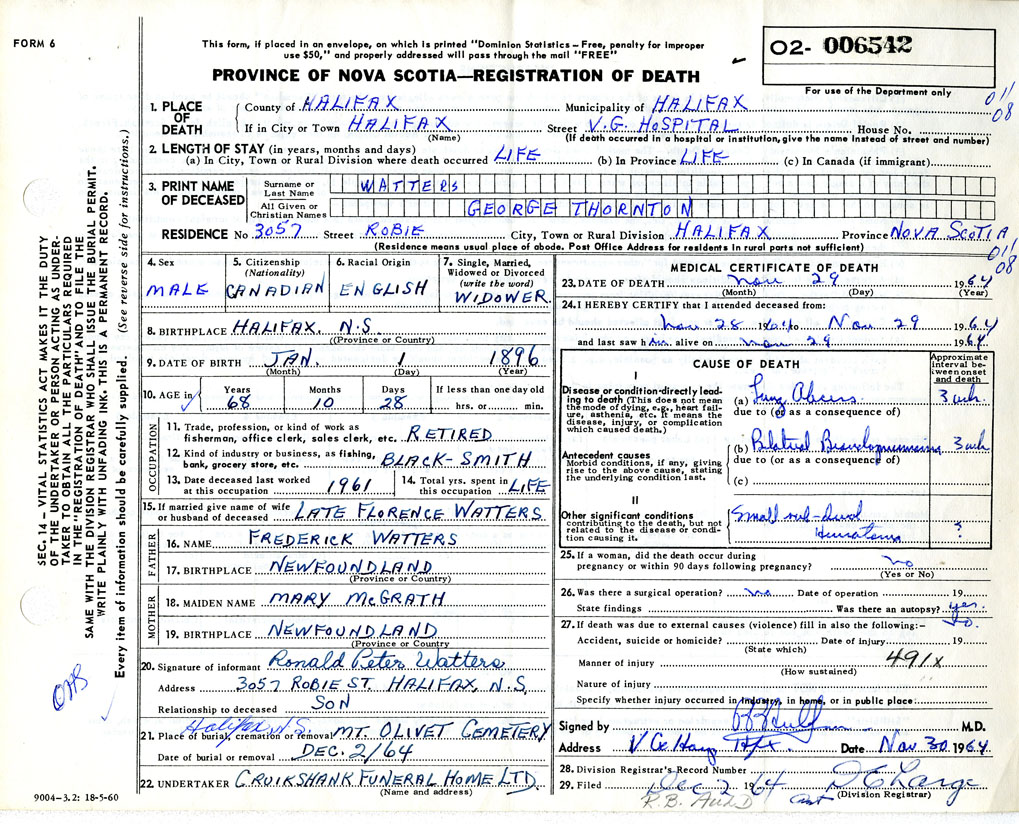 Death Registration: Year: 1964 number: 6542