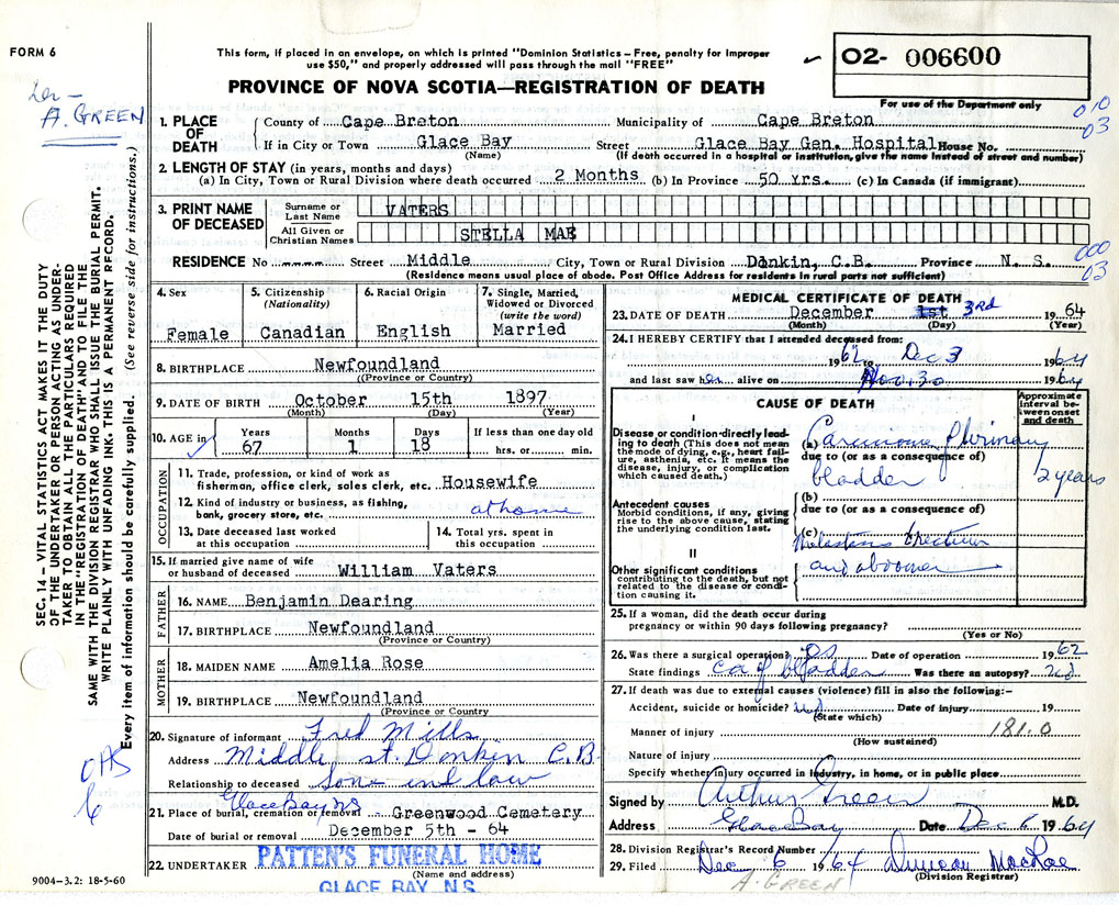Death Registration: Year: 1964 number: 6600