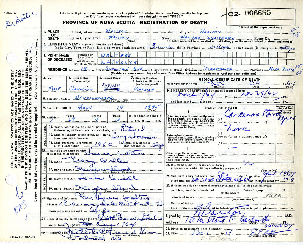 Death Registration: Year: 1964 number: 6685