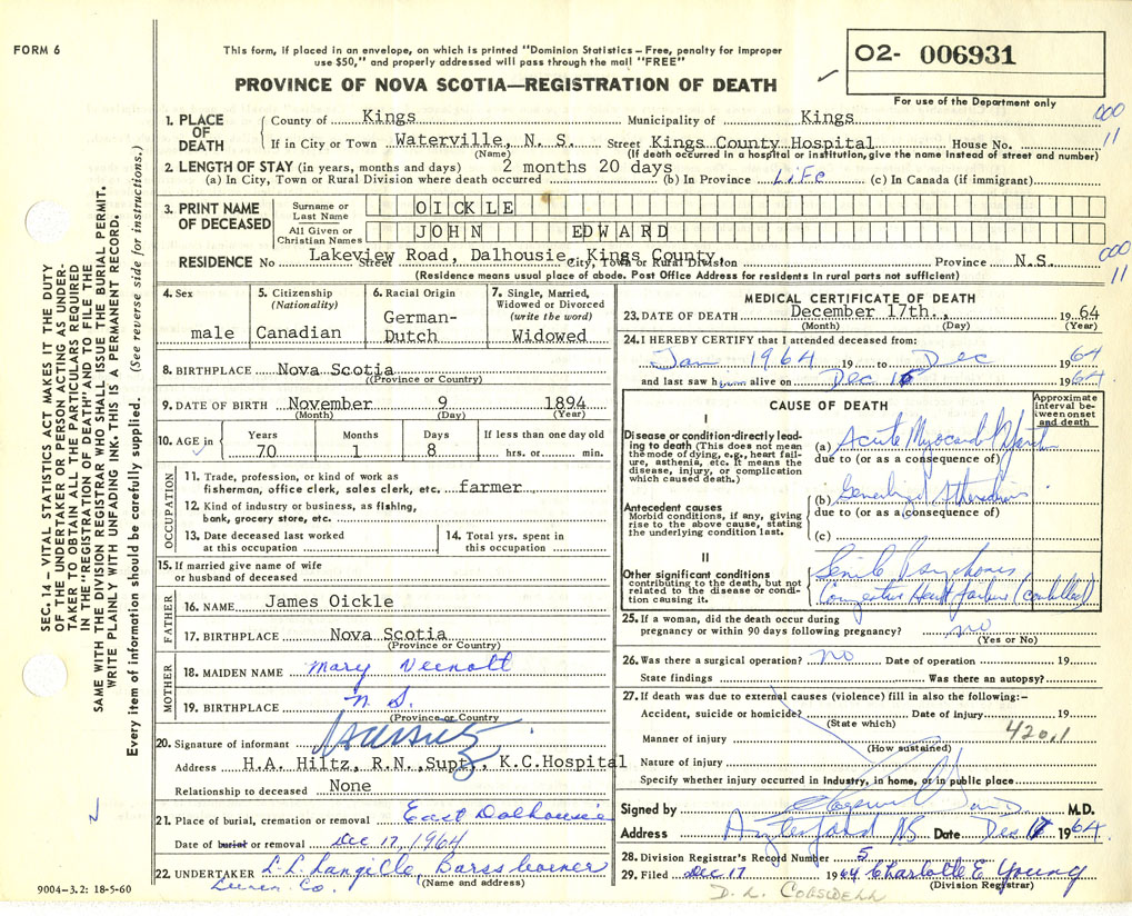 Death Registration: Year: 1964 number: 6931