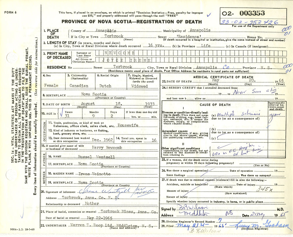 Death Registration: Year: 1965 number: 3353