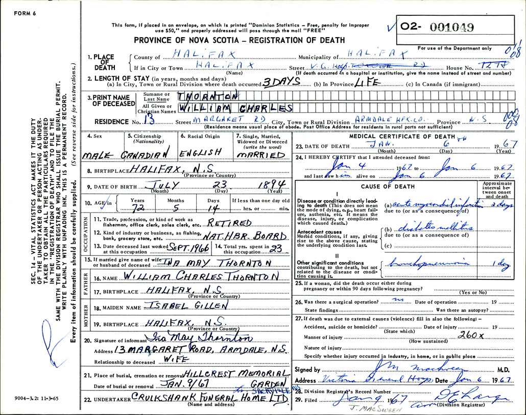 Death Registration: Year: 1967 number: 1049