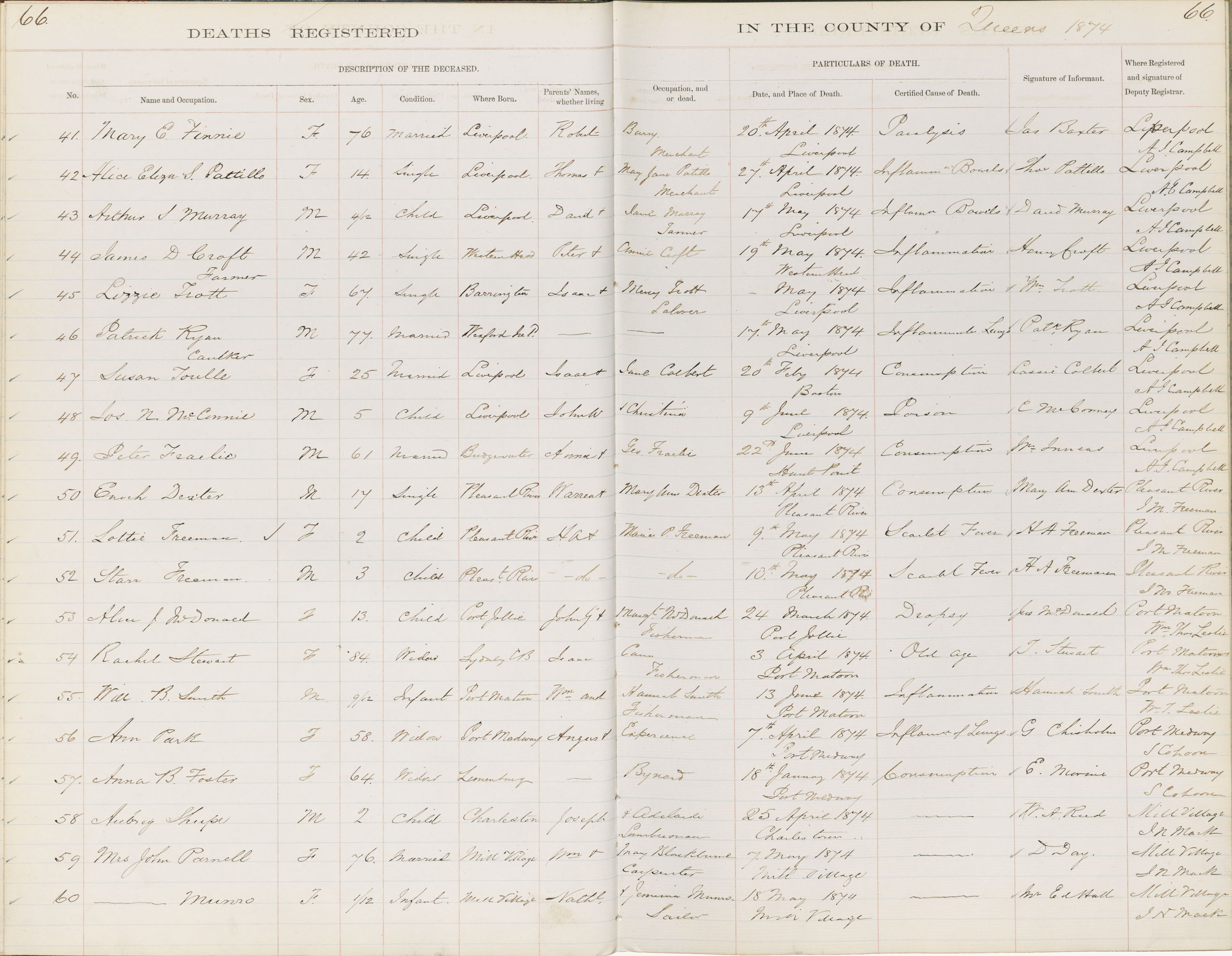 Death Registration: Year: 1874 book: 1814 page: 66 number: 60