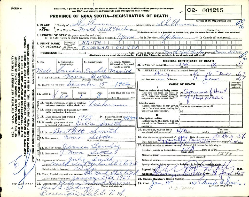 Death Registration: Year: 1967 number: 1215
