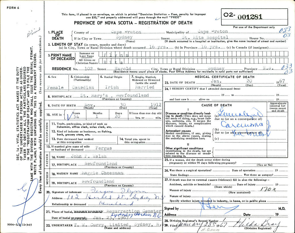 Death Registration: Year: 1967 number: 1281