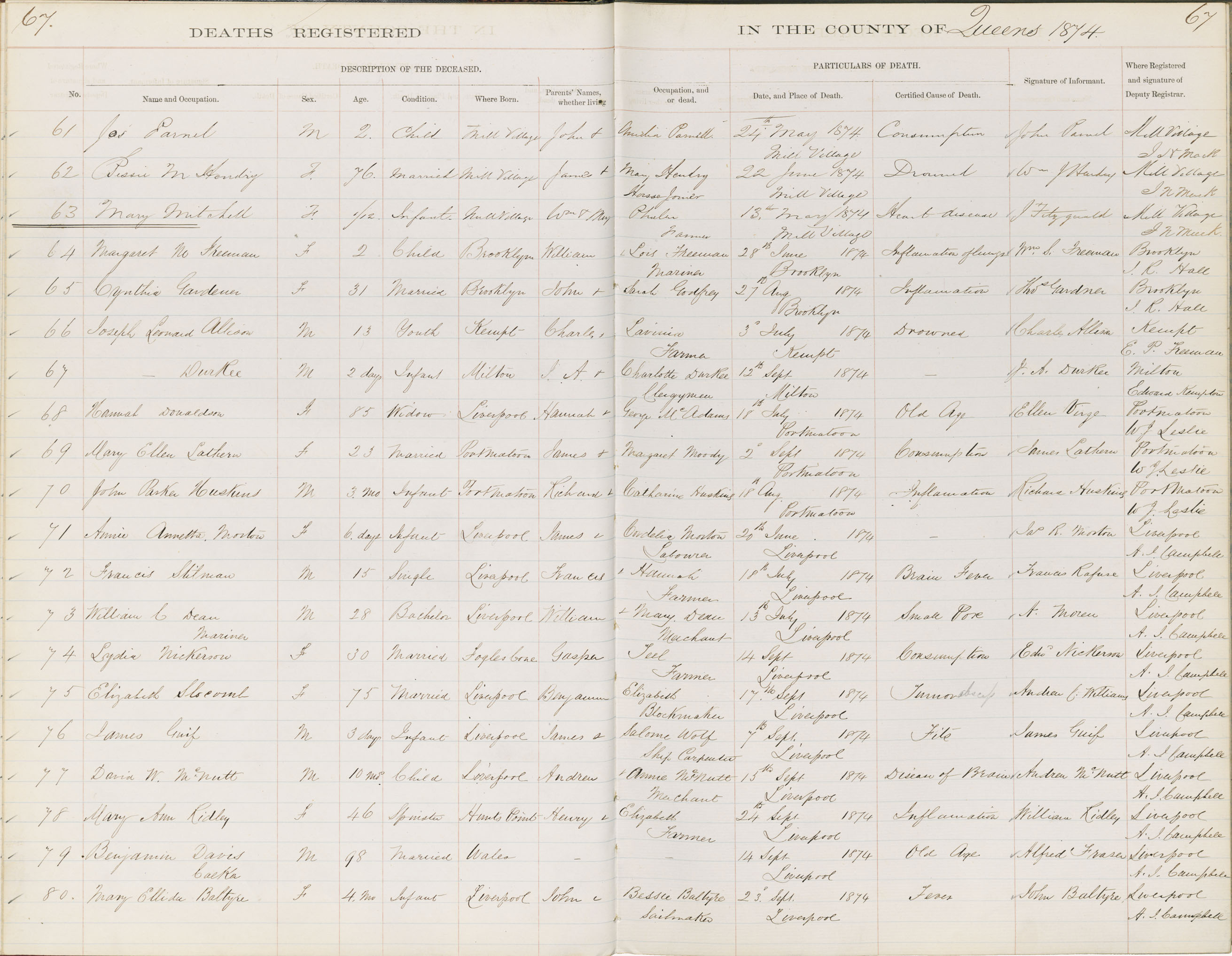 Death Registration: Year: 1874 book: 1814 page: 67 number: 80