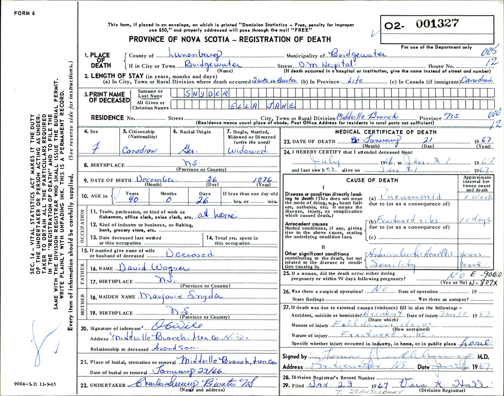 Death Registration: Year: 1967 number: 1327