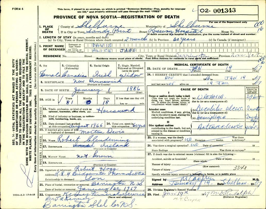 Death Registration: Year: 1967 number: 1343