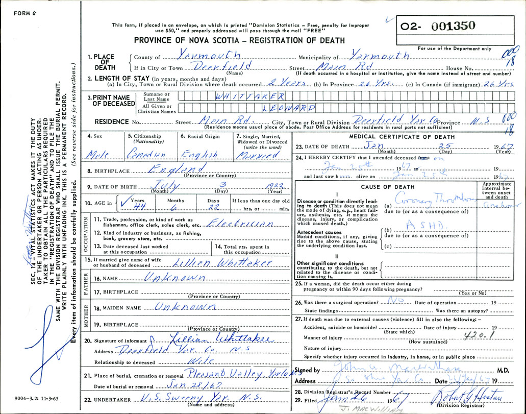 Death Registration: Year: 1967 number: 1350