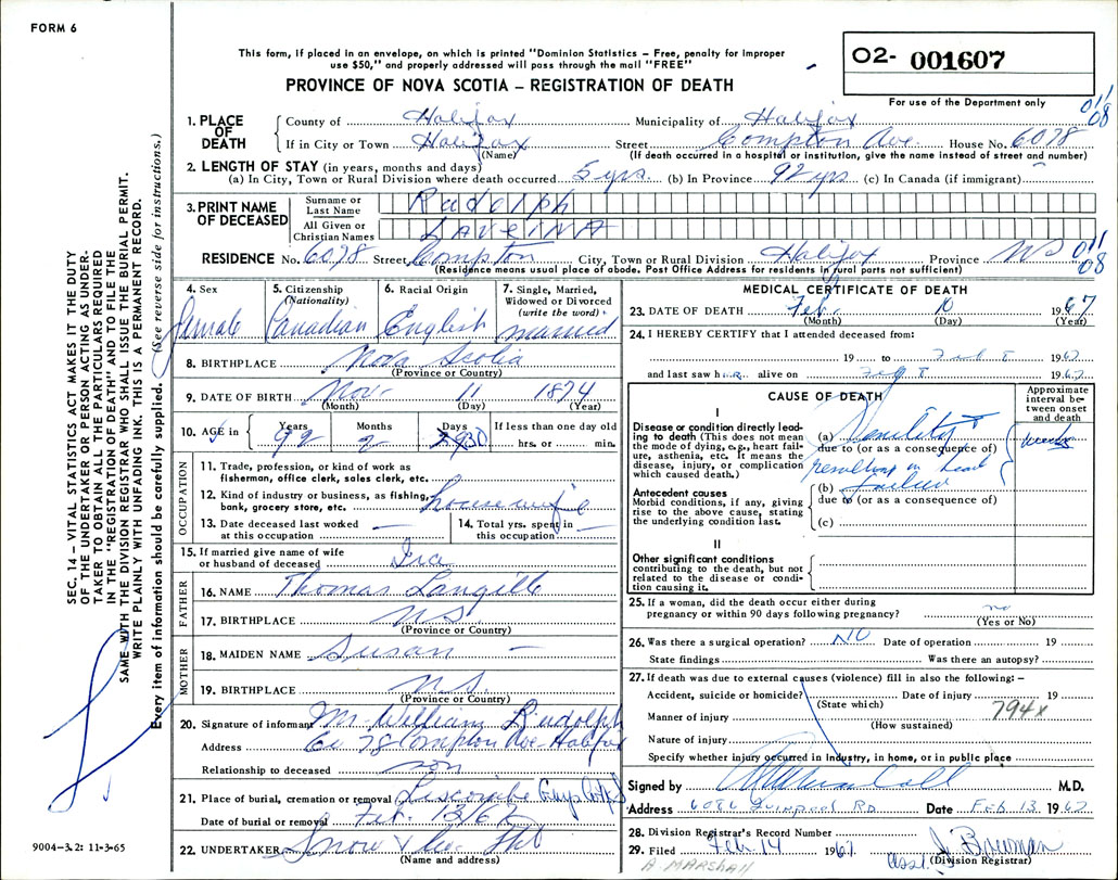 Death Registration: Year: 1967 number: 1607