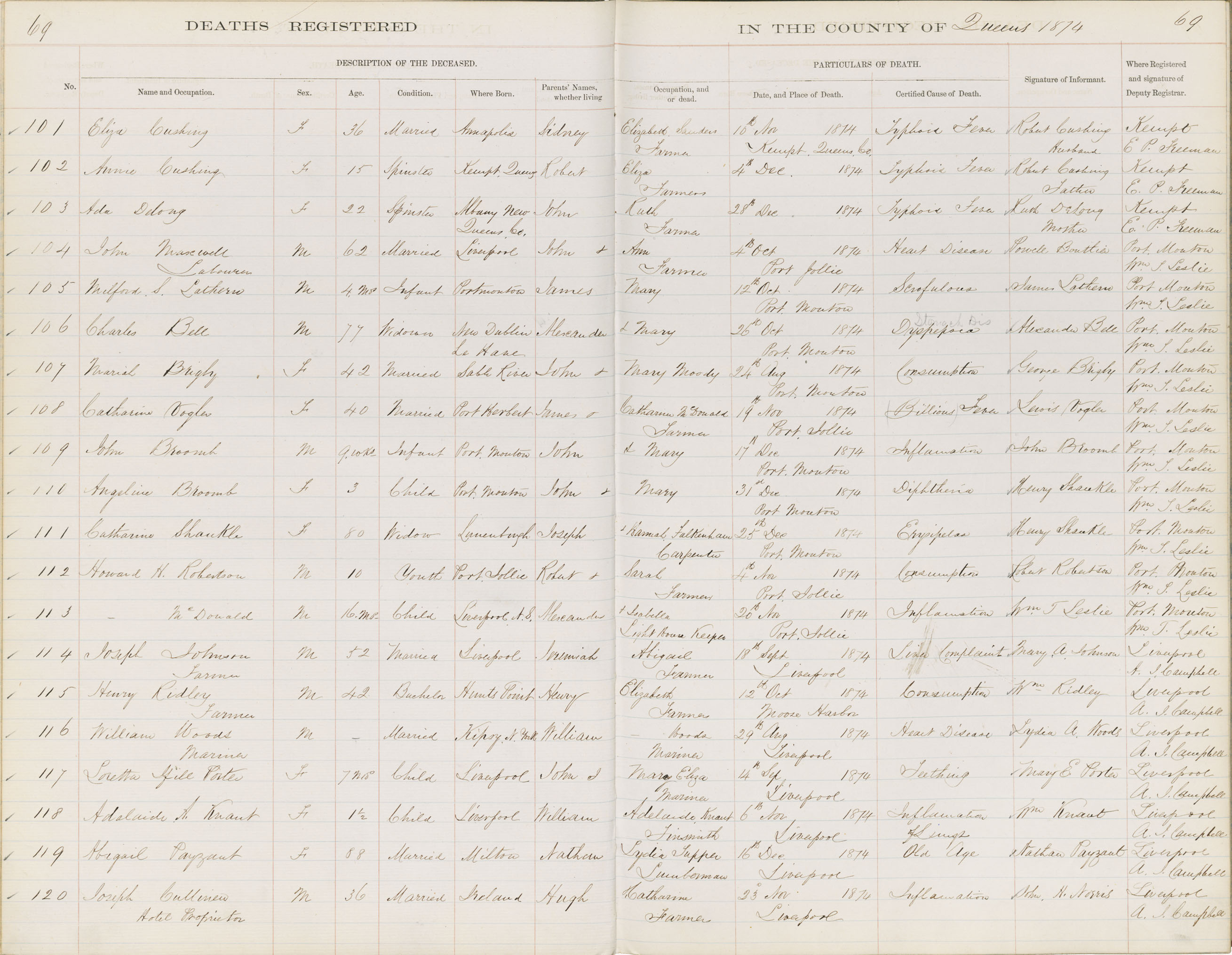 Death Registration: Year: 1874 book: 1814 page: 69 number: 120