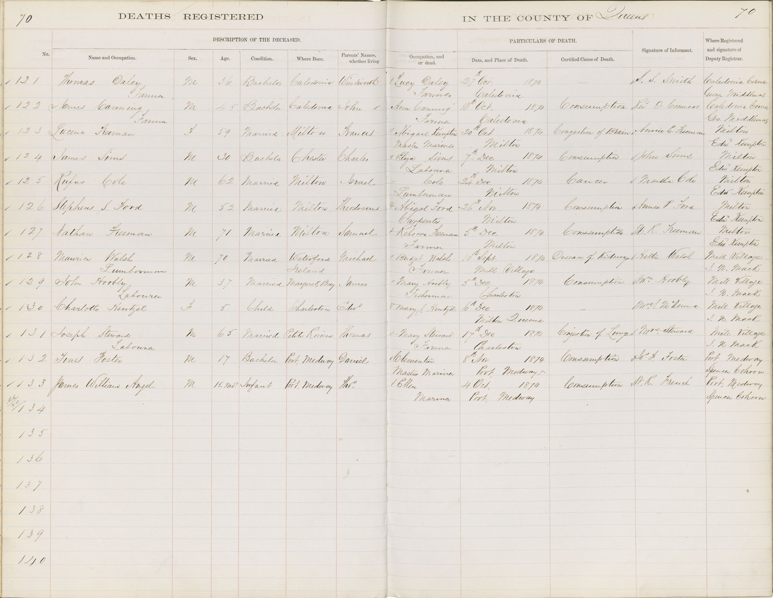 Death Registration: Year: 1874 book: 1814 page: 70 number: 133