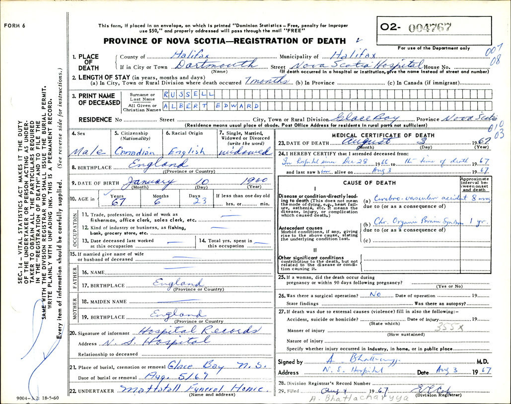 Death Registration: Year: 1967 number: 4767