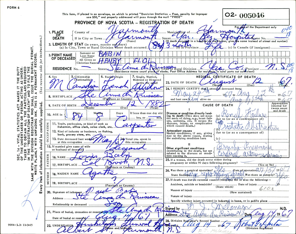 Death Registration: Year: 1967 number: 5046