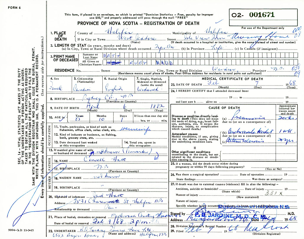 Death Registration: Year: 1968 number: 1671