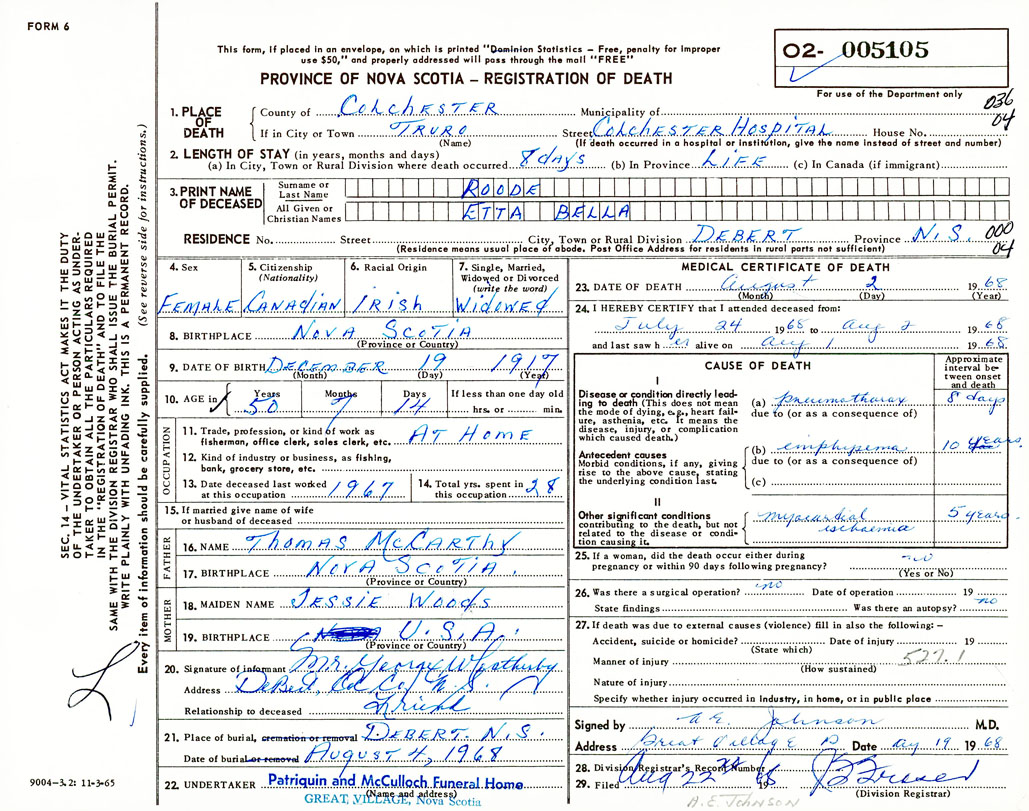 Death Registration: Year: 1968 number: 5105